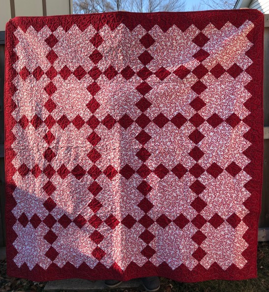My first attempt at quilting. Its an Irish chain quilt pattern and I’m more or less winging the design out of a book with some graph paper. I took the 1 night quilting class at JoAnn Fabrics and Mark showed me how to use his sewing machine. It turned out pretty well for someone who couldn’t sew more than a button a few months ago.