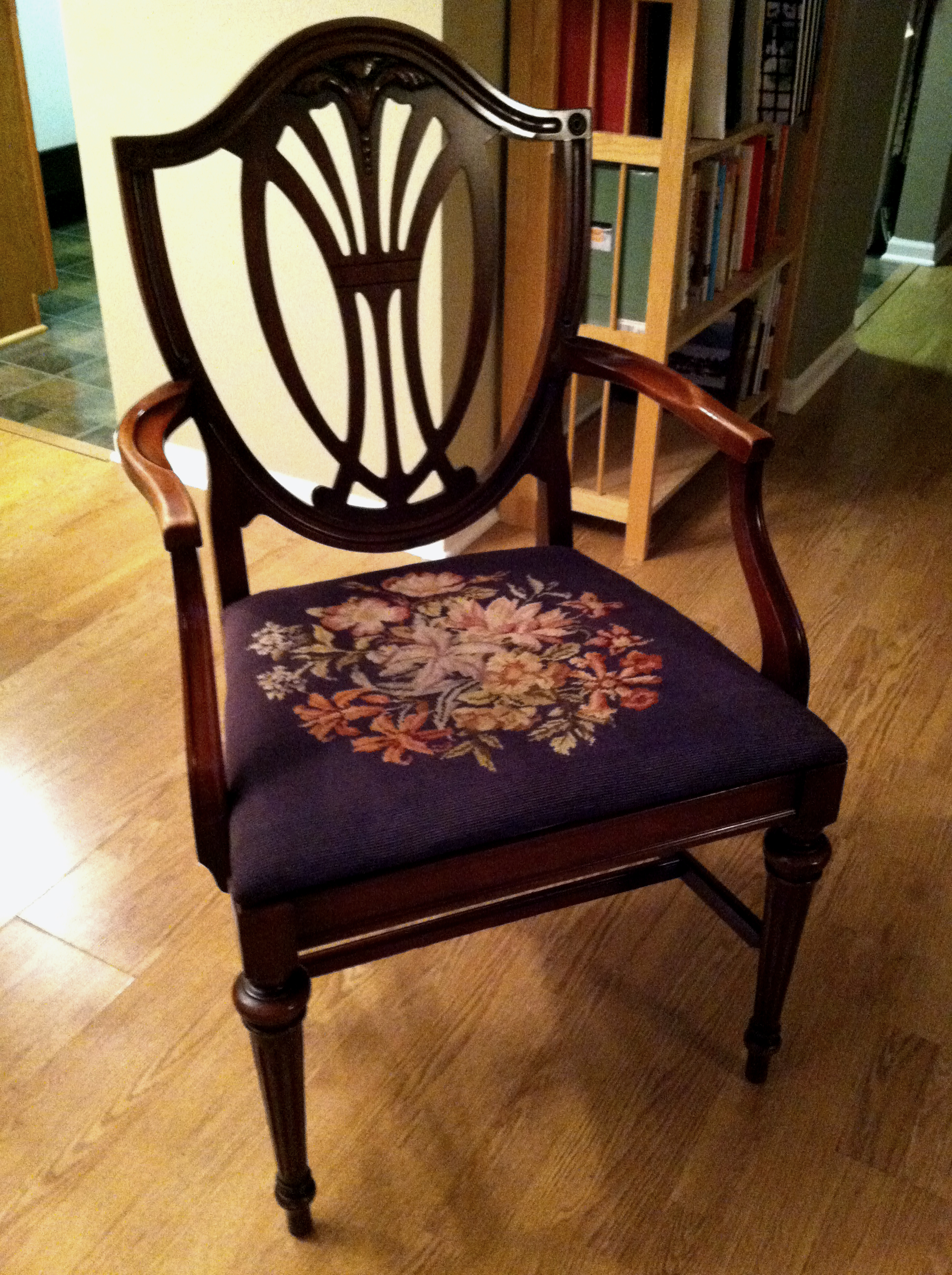 In our home we have several pieces of antique furniture, some inherited, some purchased, and some received as gifts. They are among my favorite belongings, because they add a timeless character to our everyday activities. My dining room set is particularly special to me, because it was handed down to me from my grandmother, who was a teenager in 1941 when the dining set was purchased. My great grandmother Dora made the needlepoint seat covers herself.