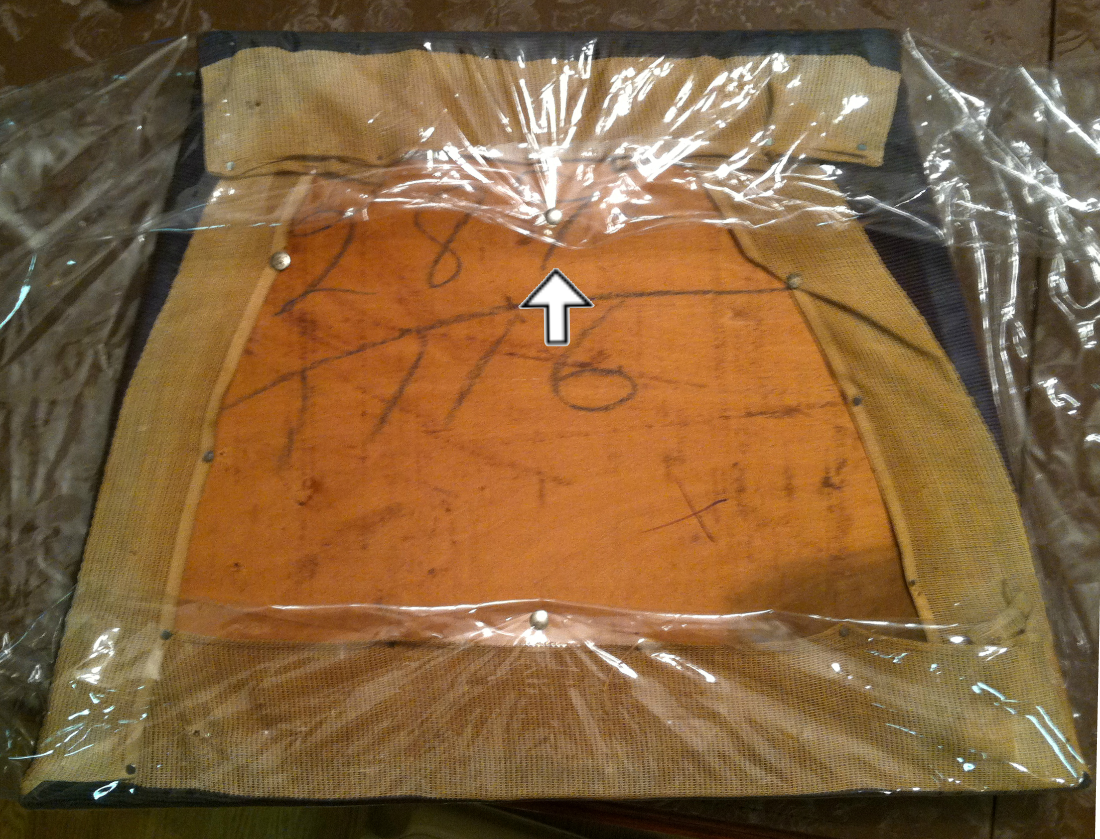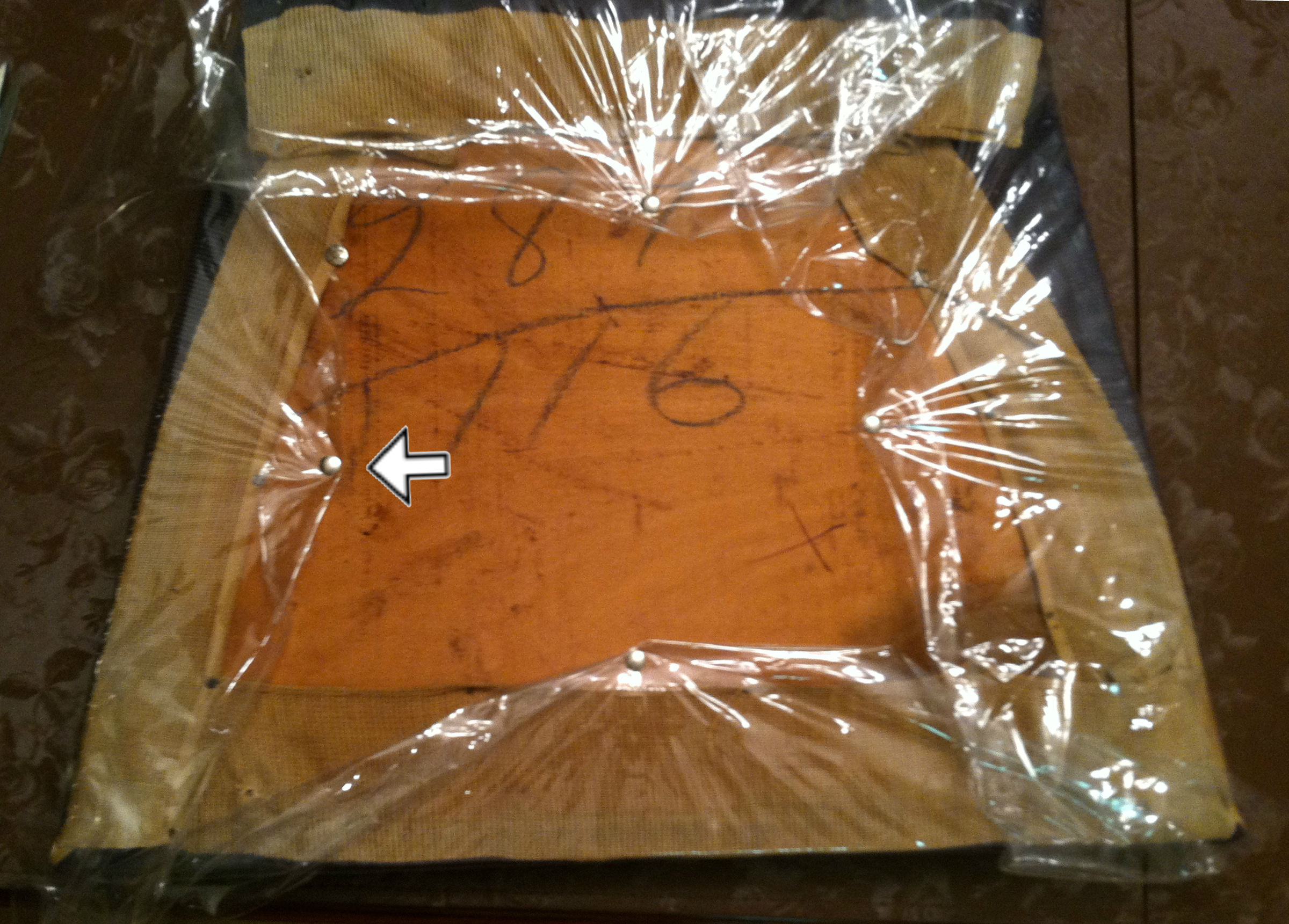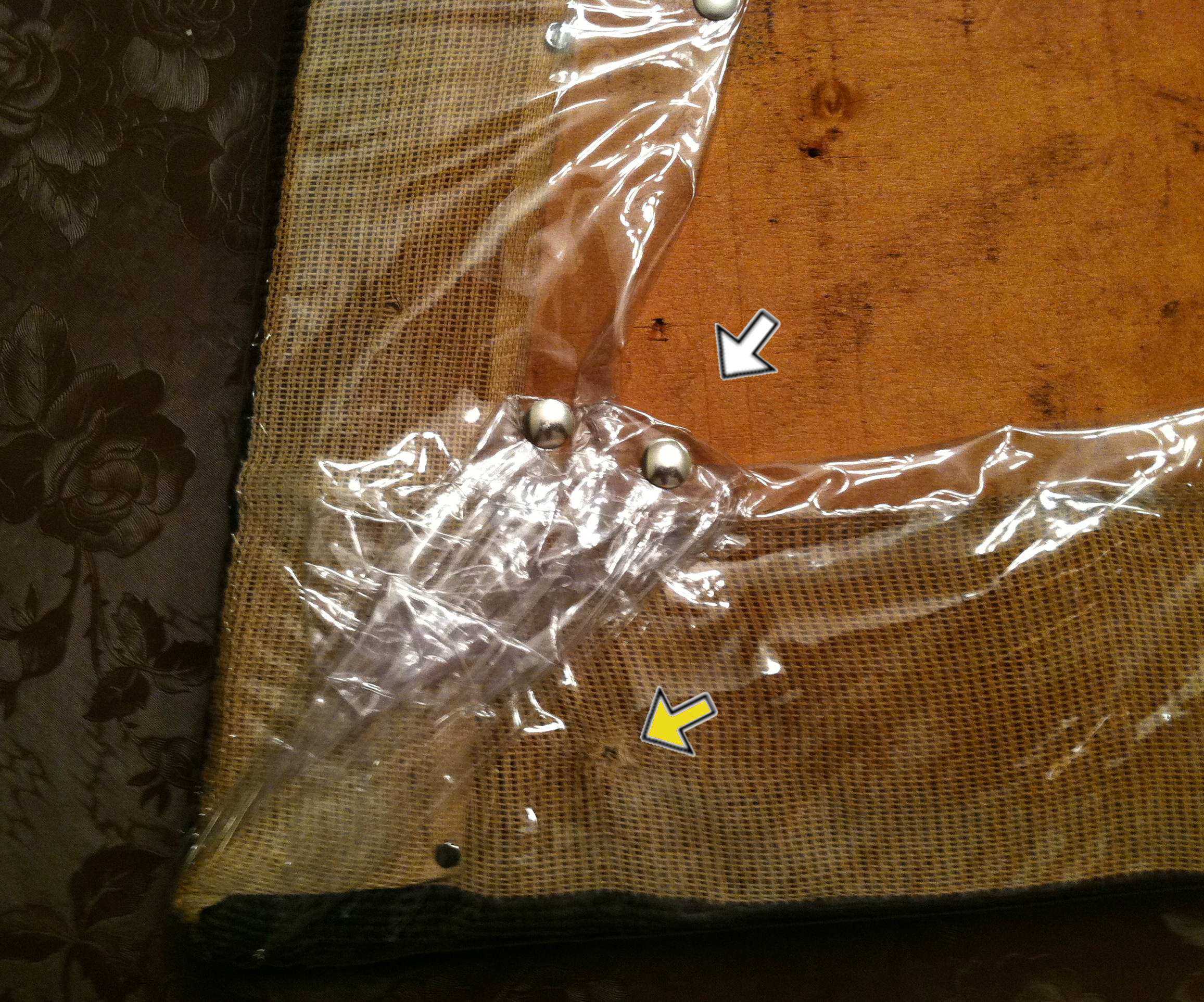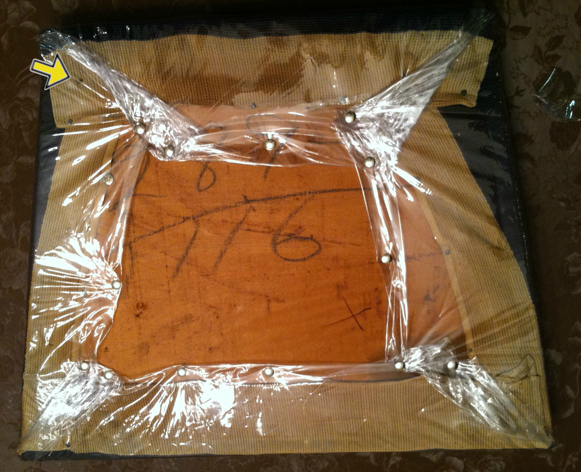 Securing the corners is a bit tricky. You’ll need to pull and fold the liner over to keep the top of the cushion free from wrinkles, and secure with one or more tacks. Also you’ll want to keep in mind where the screw holes are that the chair frame screws into (see the yellow arrows). Don’t cover the screw holes with the folded liner, or you won’t be able to reattach the cushion to the chair frame. Trust me, it’s no fun.