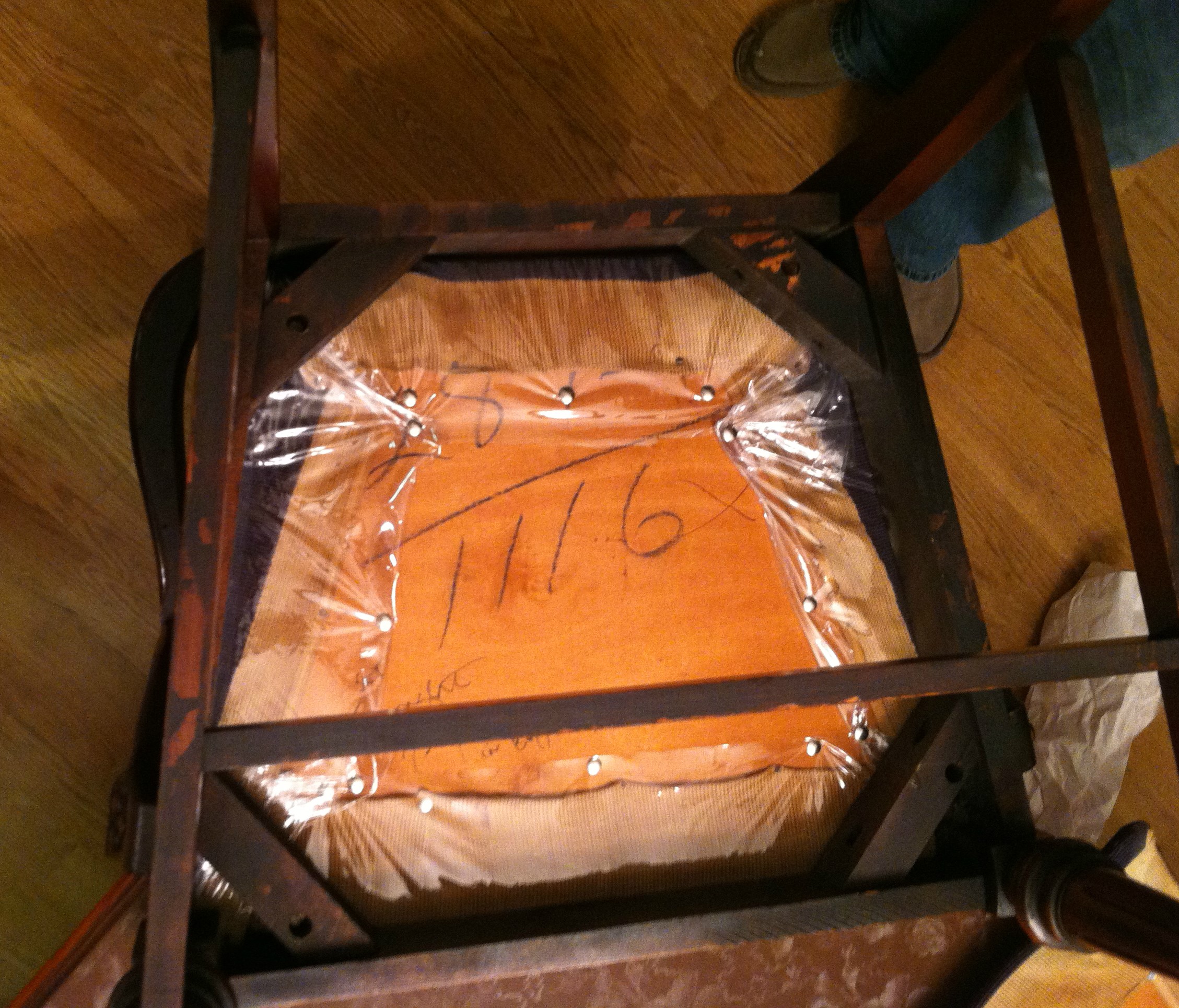 Since we don’t have a kitchen table, our dining set gets plenty of use, and I began to worry about spills and stains ruining the delicate wool seats. This worry increased after we brought home our new kitten last month, as cats are known to relish in the destruction of precious home furnishings.