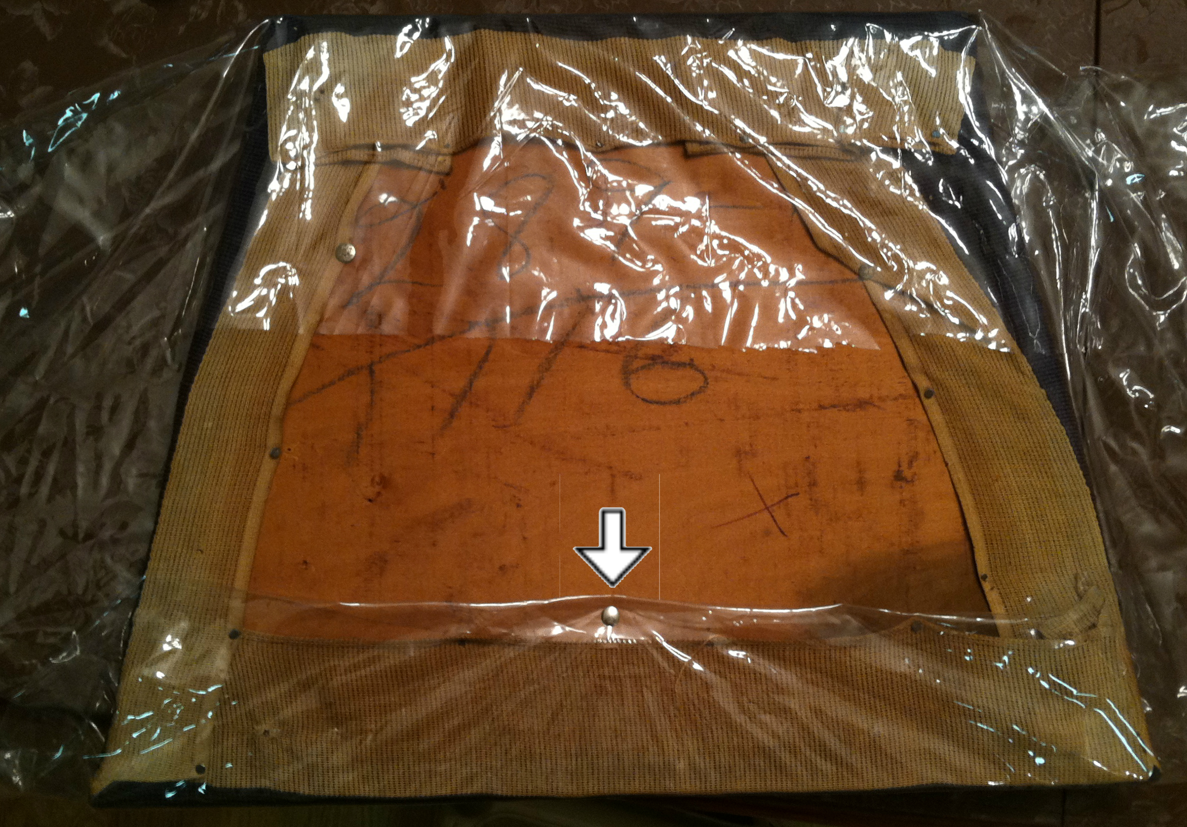 Flip over the chair and remove the seat cushions by unscrewing the screws that attach it to the chair frame. Vacuum the chair cushion with an upholstery brush to get all the dust and crumbs hiding in it. On a clean work surface spread out one of the clear vinyl shower curtain liners. If it has creases from being folded, throw the vinyl liner in the dryer for 10 minutes on medium low heat. It doesn’t have to be totally free of creases however, because we’re going to stretch it out, so don’t worry if it isn’t perfectly smooth. Lay your cushion down near one corner of the vinyl liner.