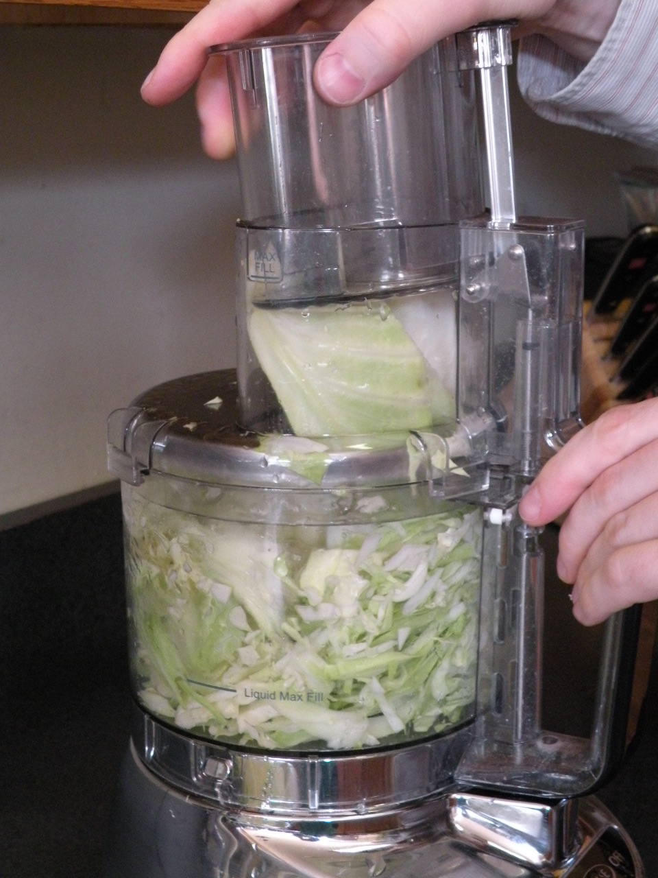 2. Chop the rest of the cabbage into little sauerkraut-sized bits. You can leave the core in, or you can cut it out and feed it to your neighborhood bunny. I used a Cuisinart, but a simple knife works just as well.