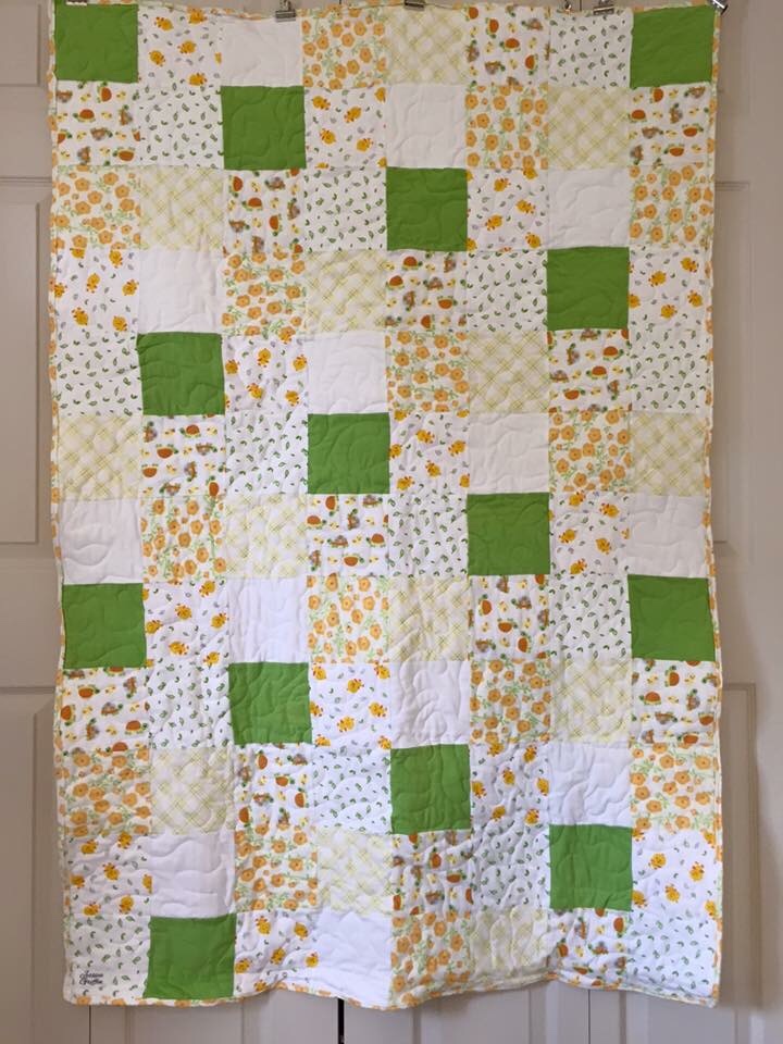 I made a neutral baby quilt for a girlfriend of mine. It has little ducks and turtles and flowers on it, in shades of sage green and sunny yellow. The backing is soft flannel also. It’s a repeating pattern of squares.