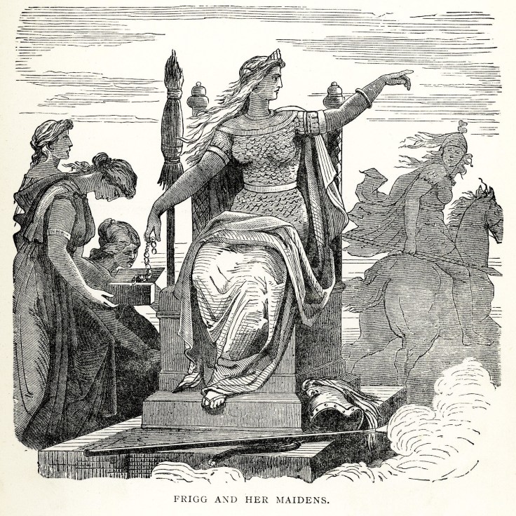 Frigg (old Norse “beloved one”) is the queen of Asgard and wife to Odin the all-father. Frigg is a sorcerer and associated with love, marriage, fertility, and motherhood, she also has the power of prophecy and yet she never reveals what she knows about the future. The English weekday name Friday (ultimately meaning ‘Frigg’s Day’) bears her name. After Christianization, the mention of Frigg continued to occur in Scandinavian folklore.