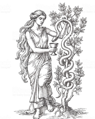 Hygieia and her four sisters each performed a facet of Apollo’s art: Hygieia (health, cleanliness, and sanitation); Panacea (universal remedy); Iaso (recuperation from illness); Aceso (the healing process); and Aglaïa (beauty, splendor, glory, magnificence, and adornment).