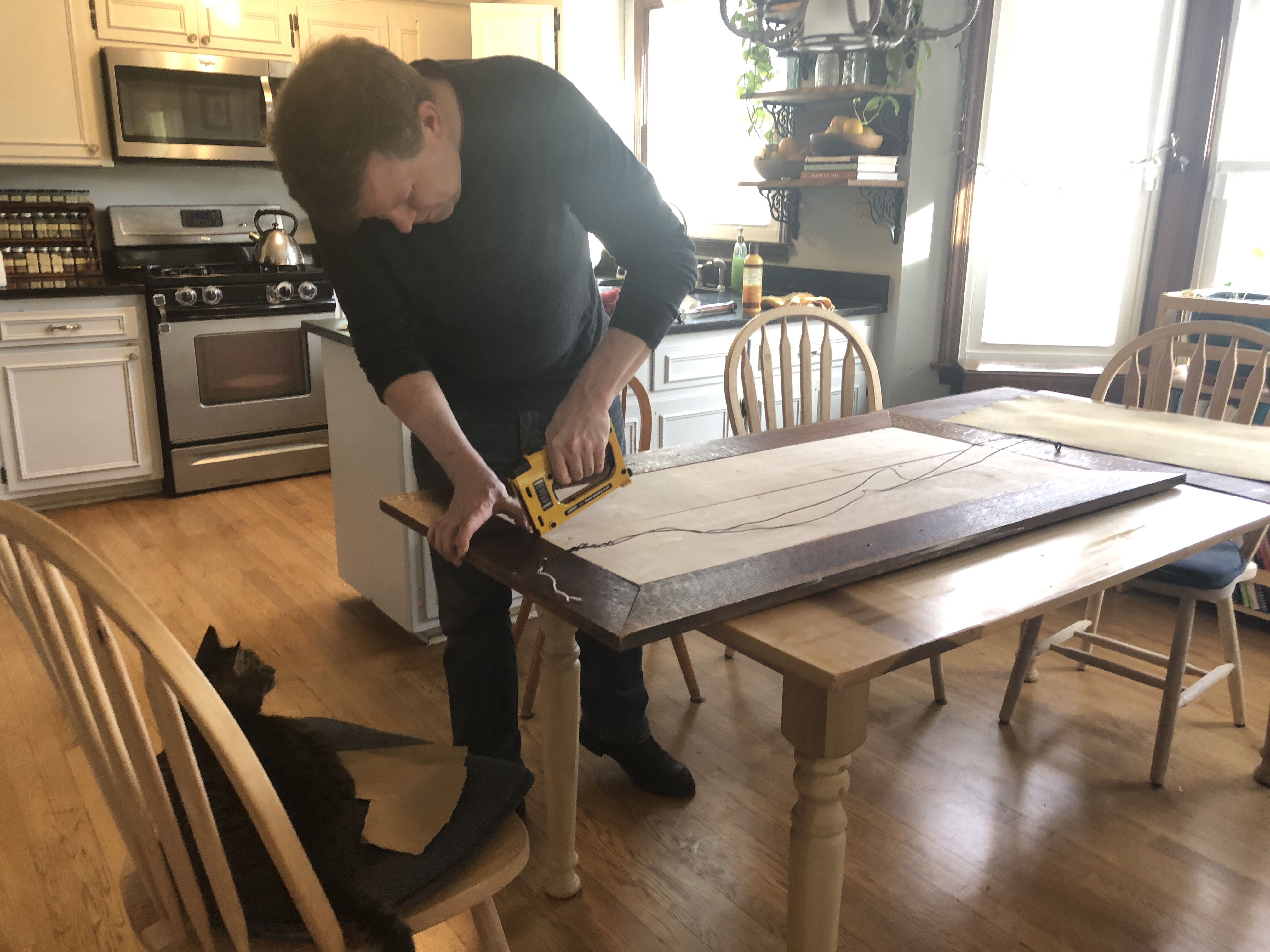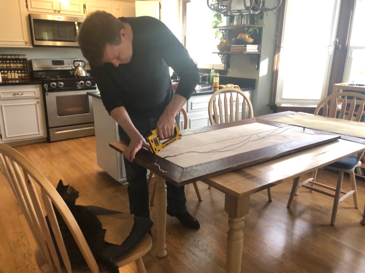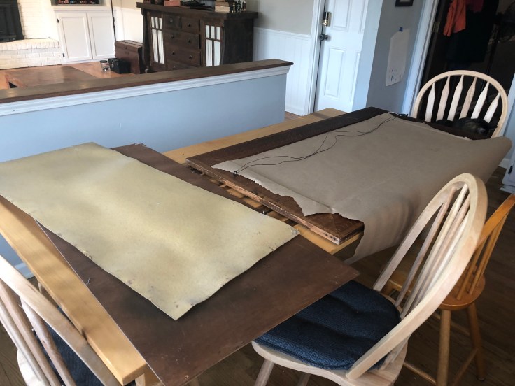 The original backing, left, was in pretty bad shape. It had grown flimsy and moldy and there were old spider sacks between the layers. Mark has lately become quite the talented picture frame maker, so he had all the tools necessary to repair and replace the backing.