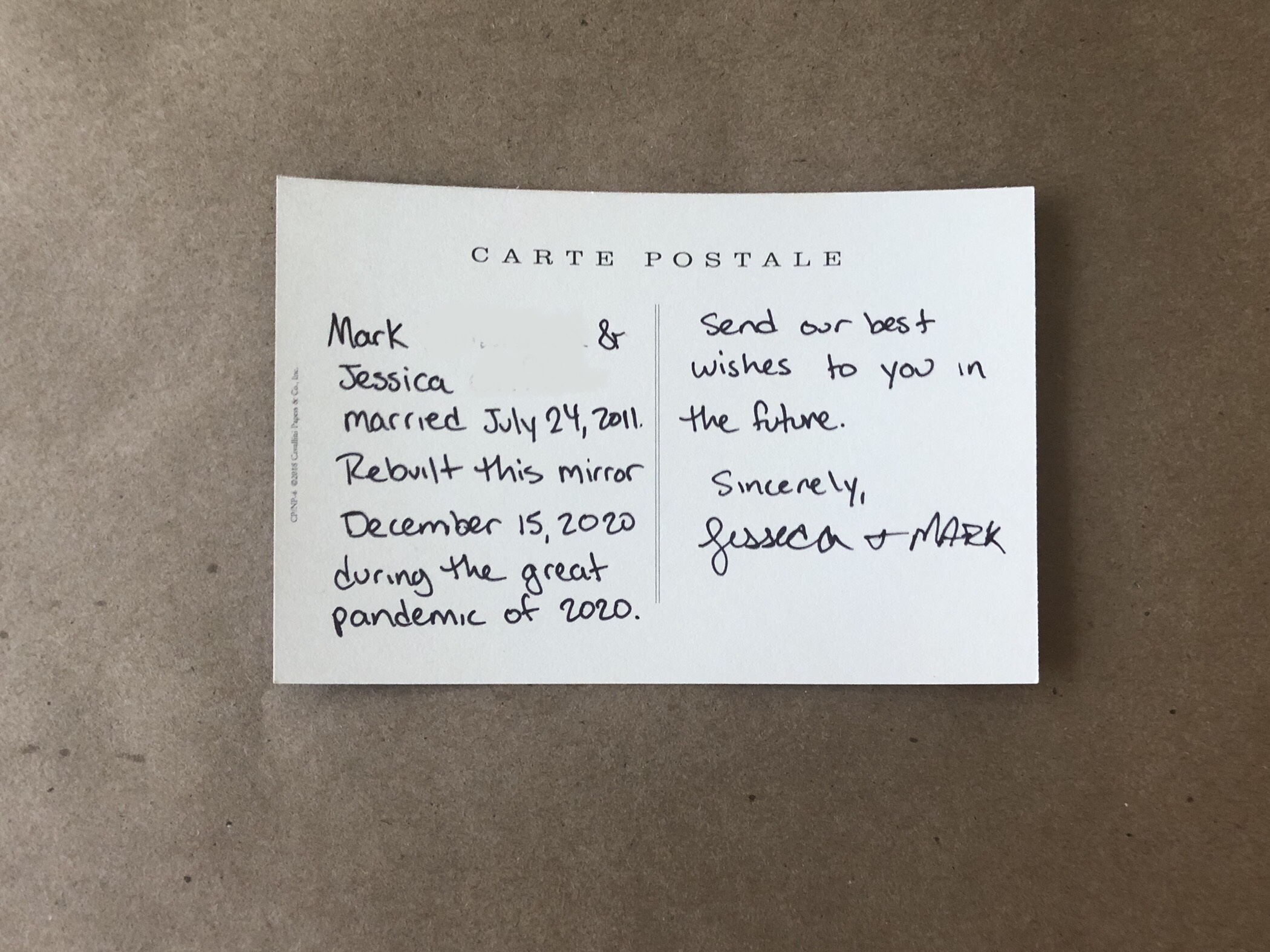 Before replacing the frame backing, Mark and I placed a postcard to the next people who take the mirror apart.
