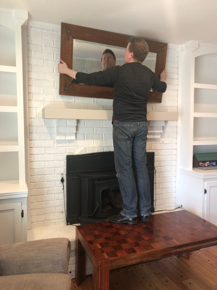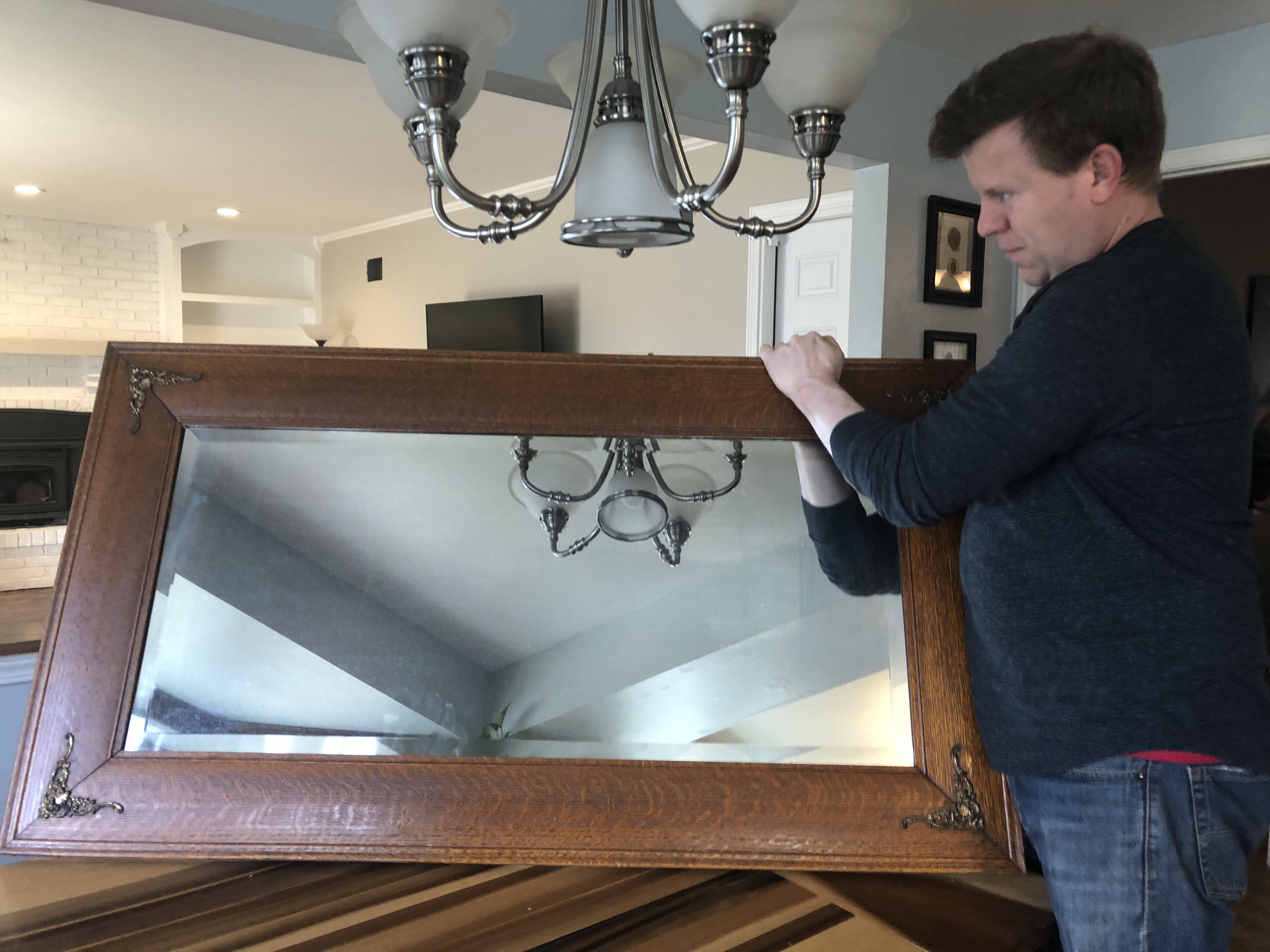 Mark and I picked up this antique quarter-sawn oak mirror at an antique store in Chicago in 2017 and its been hanging above our fireplace ever since. As we painted the fireplace and added the surrounding shelves, we took the mirror down and replaced the back of the frame.
