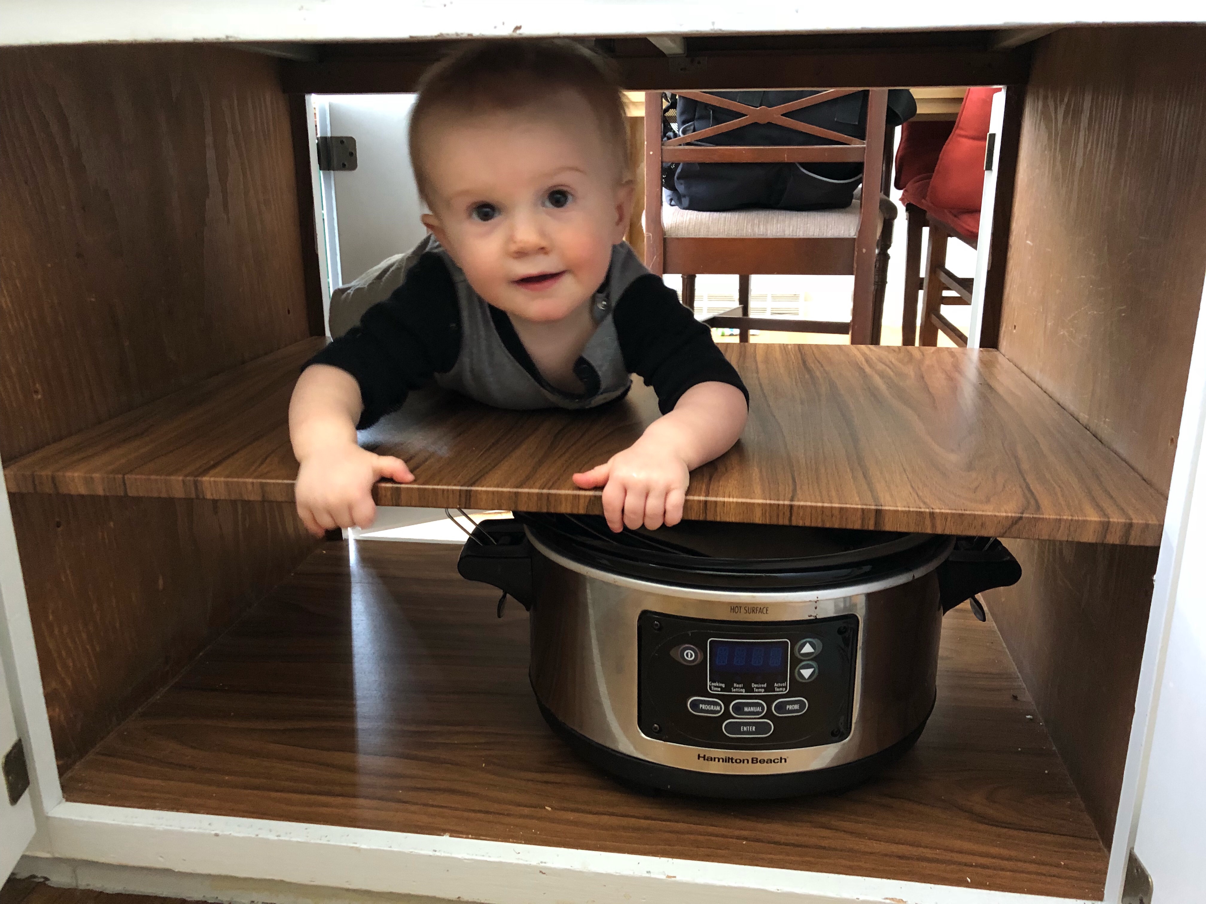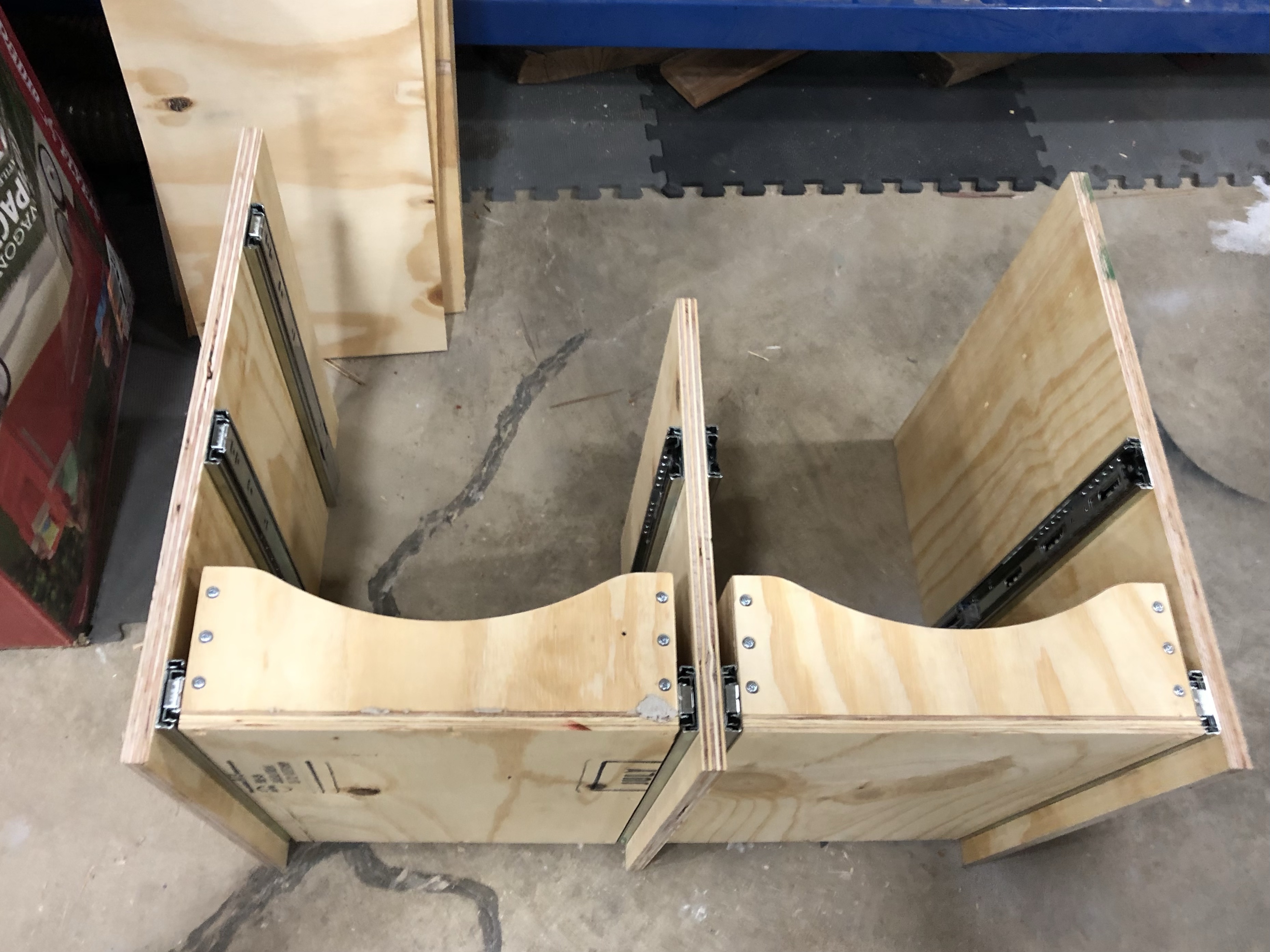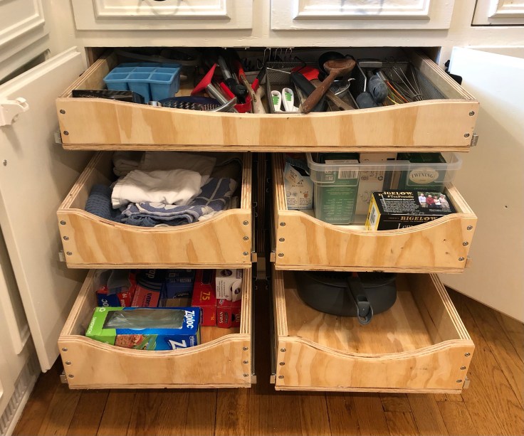 Let me tell you, one of my favorite upgrades we’ve done to this kitchen is a set of drawers Mark built for a cabinet that had been tragically underutilized. Aside from storing the slow cooker and the odd boy, this cabinet wasn’t getting much use. And this was all the more sad for it’s central location and excellent size, and doors opening on both sides of the peninsula.