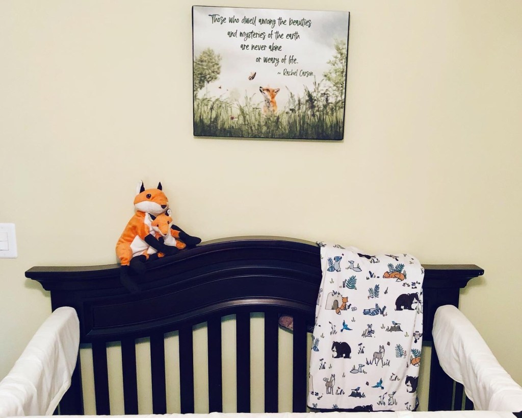 I love how it turned out with the fox lifting his nose towards the butterfly in fascination. It also ties in beautifully with the woodland themed nursery for our little one.